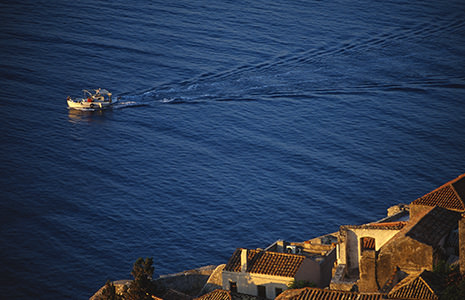 Auf der südlichen Peloponnes bei der mittelalterlichen Felsensiedlung Monemvassia, die unsichtbar gegen das Land auf einer Küstennase heraufgewachsen ist und ihren Blick nur aufs Meer richtet, misst das Mittelmeer seine tiefsten Stellen. Mehr als fünf Kilometer erreicht dort der Graben zwischen zwei tektonischen Platten und die Meeresoberfläche wogt behäbig wie schwere Tinte. In einfachen Tavernen kann man da die Sinne ins unergründliche Blau versenken. Ein magischer Ort. Mit etwas Glück kommt eine Wirtin und erkennt, dass sich hier gerade ein neuer Dialog entspinnt. Und sie zerteilt ein paar Tomaten, häufelt Oliven dazu, schnitzt griechische Rautenmuster in die Ränder der Gurkenscheiben und schneidet dünn den Schafskäse dazu. Ein naturtrüber Fasswein, ein Korb mit Brot kommt auf den Tisch. Kein Stückchen Oktopus dabei, den Göttern sei Dank.