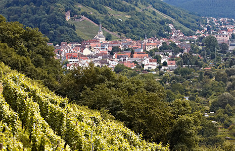 Hundert Meter über dem Tal führt ein Weinwanderweg entlang. Und immer ist irgendeiner oben, häckselt und unterhält vorbeikommende Wanderer. Auch Winzer Reinhold Hillerich, der die Steillagen des Hochbergs liebt. „Hier haben die Winzer seit Jahrhunderten eine unfassbare Leistung vollbracht. Wir haben etwa 300 Kilometer Trockensteinmauern stehen, wenn man sie aneinander reihen würde, und für jeden Quadratmeter braucht man eine halbe Tonne Sandstein“, erklärt er das Kunstwerk, huscht hier und dort durch die Rebzeilen, zeigt wie die Reben aufs Spalier gebunden werden, während sie bei fast neunzigprozentiger Steillage ins Flusstal zu fallen scheinen. Der Buntsandsteinboden gibt dem Wein seinen ureigenen Geschmack, der ganz ohne Maschineneinsatz kultiviert wird. So ist es hier oben friedlich und wie aus der Zeit gefallen geblieben.