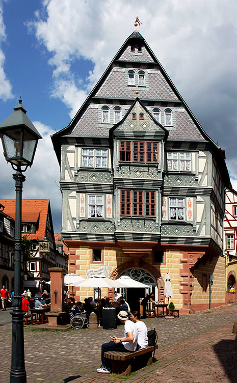 Das Prunkstück Miltenbergs ist der Gasthof Riesen, ein Fachwerkjuwel aus jener Zeit als der Mainzer Erzbischof den Miltenbergern das Stapel-, Umschlags- und Geleitrecht verlieh. Das war 1368, und der Ort stieg zur bedeutenden Handelsstadt auf. „Man nennt uns hier auch die Perle des Maines“, kann man von einem Stadtführer hören. Vor einer Ausflugsgruppe von den vielen Mainschiffen, die hier landen, schwadroniert er salopp über fränkische Fachwerkschnitzereien, Neidfratzen und Handwerkerzeichen, über Hexenwahn und Hochwassergefahr. „Im Hof des Riesen konnten 100 Pferde Quartier machen“, ist zu hören. König Ludwig von Bayern, Kaiser Karl IV. und Barbarossa haben in der Giebelsuite genächtigt.